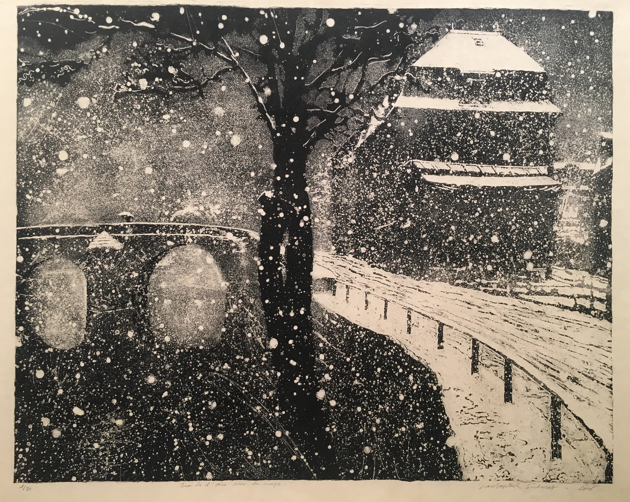 une lithographie intitulée "Quai de l'Oise sous la Neige" (à l'Isle-Adam), en hommage à Henri Rivière.